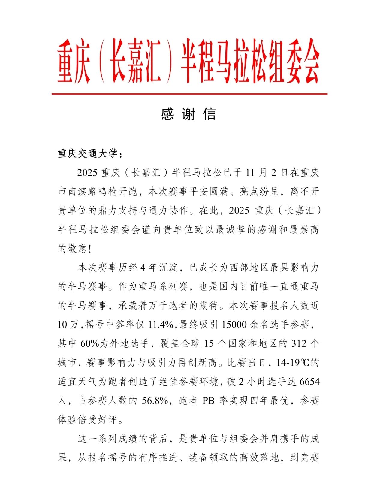 组委会《感谢信》指出,赛事志愿者们在赛事中的付出,是跑者安心奔跑的底气,是赛事圆满落幕的基石。无论是赛前还是赛后,随处可见志愿者们辛勤服务的身影,你们的微笑与热情,让选手感受到了“重小马”的温暖,成为赛道上一道靓丽的风景,体现了重庆交通大学同学们的专业素养与责任担当,也让“长嘉汇半马”的品牌印记更加深刻。